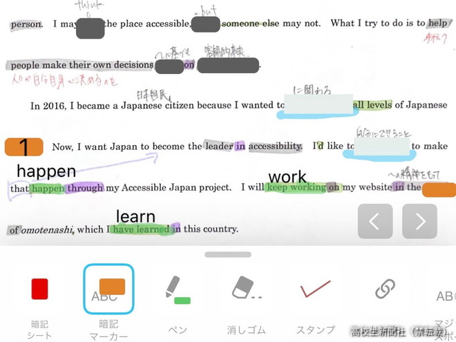プリントや教科書などの写真に、スマホの画面上で書き込めます。文字をマーカーで隠せたり、赤い文字を赤シート機能で消せたりもします。