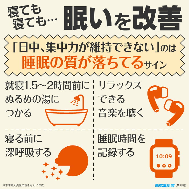 高校生新聞の高校生読者に睡眠に関する悩みを聞いたところ、「ある程度睡眠時間をとっているのに、学校で眠くなります」(高1)、「どういう状態だと、しっかり睡眠できたと言えるのですか? 何か見分けるコツが知りたいです」(高2)と声が寄せられた。睡眠をとっているつもりでも、日中の眠気やだるさを感じる高校生は少なくない。