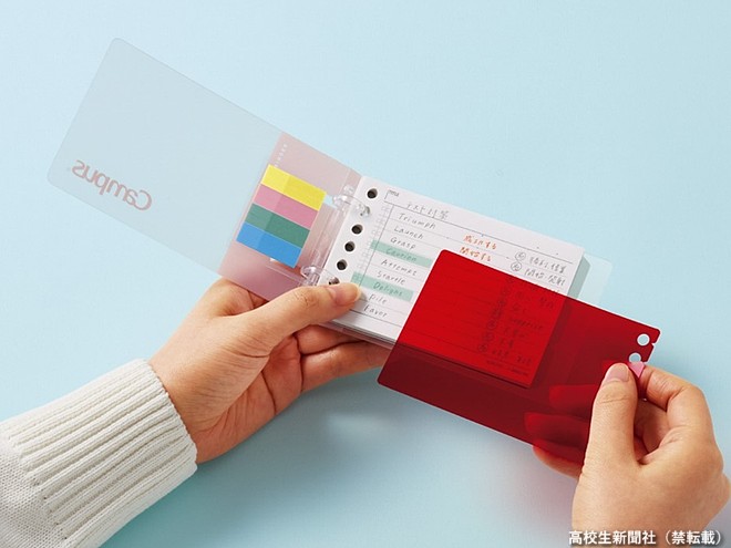 通学時の学習ストレスを解決してくれるレシピ。ミニサイズのバインダーで計画・要点・暗記用のルーズリーフを集約。単語帳として赤シートで隠せます。