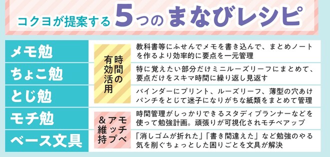 「楽しく自分に合った勉強ができるように支援したい」という思いのもと「複数の文具を組み合わせ新しい勉強法をメモ勉・ちょこ勉・とじ勉・モチ勉・ベース文具の5つの“まなびレシピ”として提案しました」(Campusのブランド戦略担当・堤沙也佳さん)。