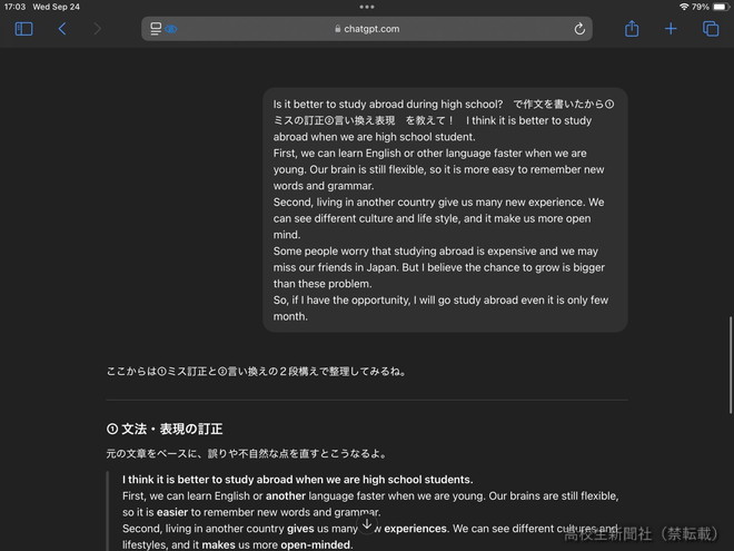 表現を学んだあとは、実際に会話や文章で使うと定着が進みます。テーマを決めて作文をしたり、ディベートのスピーチを考えたりしています。私は高校無償化やAI、オンライン学習など、社会的なトピックをテーマに取り組む場合が多いです。使いたい単語や表現が自然に入れられた時は爽快感があります。
