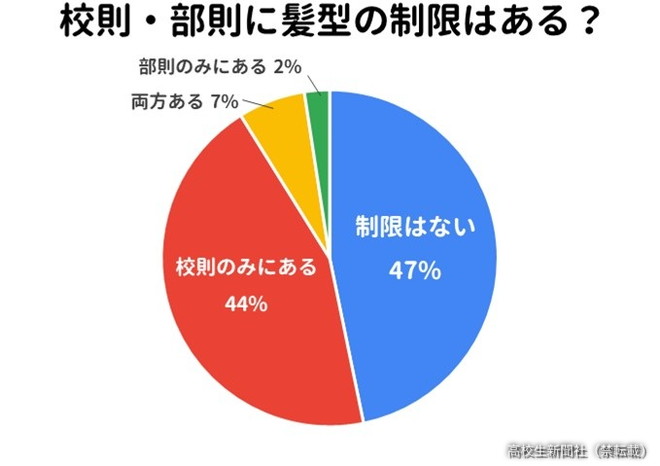 校則や部の決まり(部則)に髪型の制限があるかを尋ねると、「ある」と「ない」が半々で、校則または部則に制限があると答えた人を合わせると53%、制限がない人は47%だった。