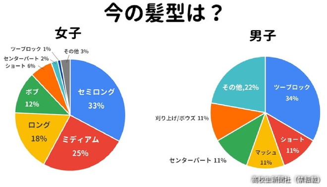 女子に今の髪型を尋ねると、「セミロング」「ミディアム」など肩から胸にかけての長さが多数を占めた。胸下まで伸ばすロングは18%だった。一方で、「ショート」や「ボブ」といった短めスタイルも2割程度いた。