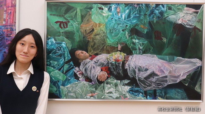 久保木千遙さん(千葉・千城台高校3年)の絵画作品「ポリーフィア」を紹介します。ゴミ袋をまとって眠る女性を描いたこの作品は、全国高校総合文化祭(かがわ総文祭2025)の美術・工芸部門に出展されました。こだわりや制作中のエピソードを聞きました。(文・写真 椎木里咲)