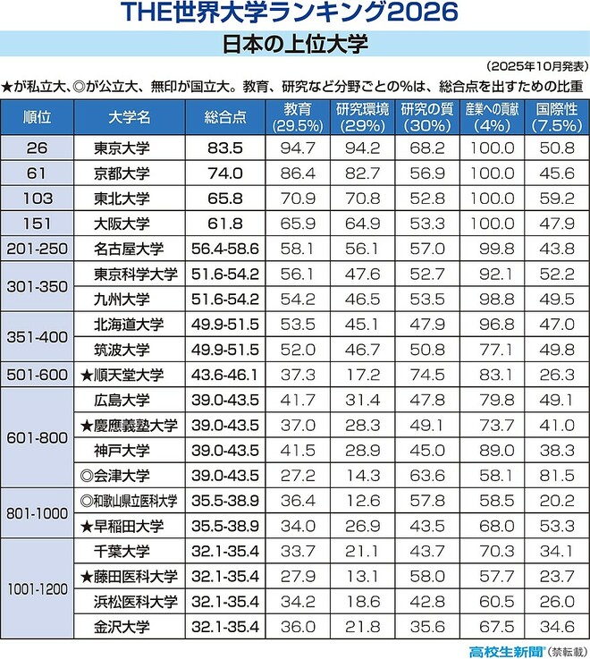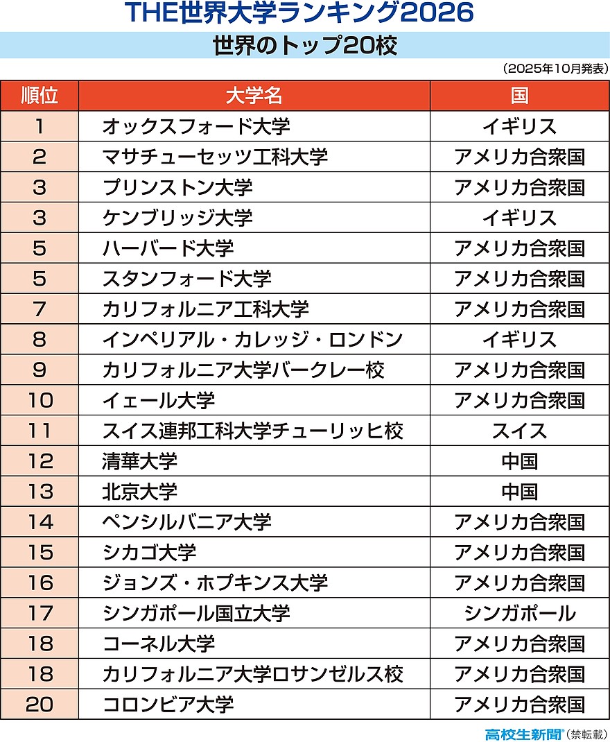 英国の教育専門誌タイムズ・ハイヤー・エデュケーション(THE)は2025年10月9日、世界の大学のうち115カ国・地域の2191校を研究力や国際性などの基準で順位付けした「世界大学ランキング」の2026年版を発表した。日本からは115校がランクインした。