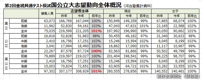 河合塾による「第2回全統共通テスト模試」の集計データ(8月実施)では、国公立大の志望者数は前年度比101%とほぼ変わらない。24~26年の受験生人口はほぼ横ばいで、27年からまた下がる。