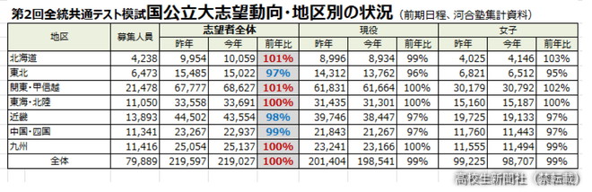 地区別で見ると、東北97%、近畿98%と若干減少しているものの、志望状況は例年並み。