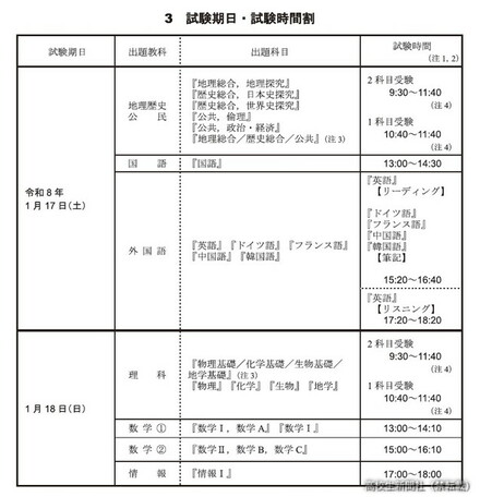 25年度の大学入学共通テストから、改訂された学習指導要領に基づく新課程に対応。新科目「情報Ⅰ」が加わり、7教科21科目になった。国語と数学②では、試験時間が10分延長。現代文の大問が1問増え、英語リーディングの大問数が6問から8問になった。