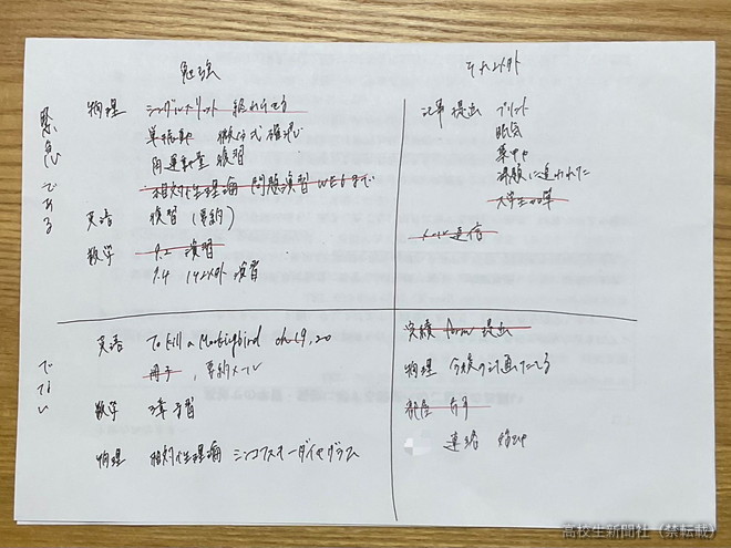 課題を期限の近い順に書き出して並べると、提出し忘れを防げます。優先順位を把握すれば、取り組みやすい課題も見つかるかもしれません。まずは立ち止まって一度整理するのが大切です。(えび=2年)