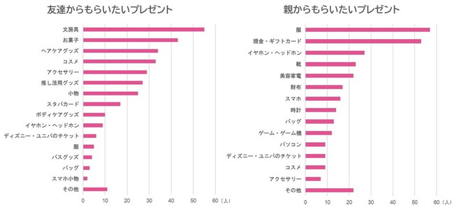 まず、友達と親、それぞれからもらいたいプレゼントを、選択肢から最大三つまで選んでもらった。友達からは「文房具」55人、「お菓子」43人、「ヘアケアグッズ」34人、親からは「服」57人、「現金・ギフトカード」53人、「イヤホン・ヘッドホン」27人が人気だった。