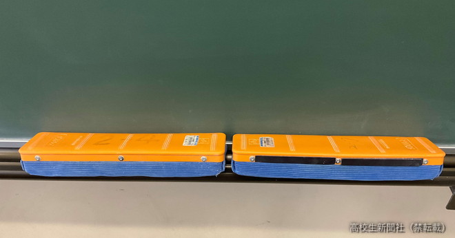 落下の主な原因は、黒板最下部の「粉受け」と呼ばれる溝と黒板消しの大きさのミスマッチだ。溝の幅5センチに対して黒板消しの幅は7センチで、2センチ大きい。教員、生徒それぞれ10人程度に話を聞いたり、黒板の整備業者らにも取材したりして、粉受けと黒板消しの大きさに関する謎を探った。