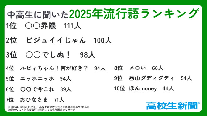 今年も残り約1カ月。中高生の間でどんな言葉が流行したか。LINE公式アカウント「高校生新聞編集部」をフォローしてくれている読者の中高生151人に10月にアンケートを実施。ベスト10に入った言葉を、投票した中高生のコメントともに紹介する。(30語のリストから複数可で選択してもらう形式で実施)(和田七望)