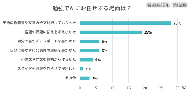 一方で、補助的な利用ではなく自分自身で考えずAIに「全てお任せ」してしまう場面はあるか、複数回答で聞いた。そうした使い方はしていないと回答した人が多かったが、「英語の教科書や文章の全文翻訳」28%、「宿題や課題の答えを考えさせた」19%などがあがり、特に英語の課題で全部任せる使用が目立った。