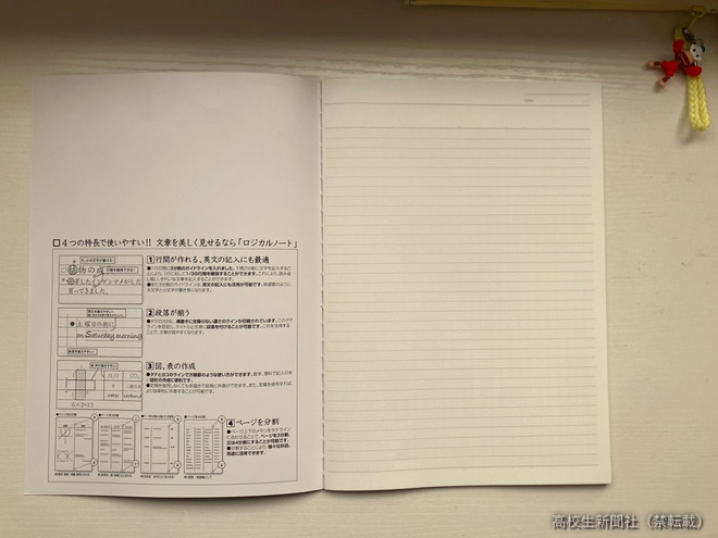 下敷きを使う時が多いのですが、このノートは下敷きとの相性が抜群に良いと感じます。表紙ではイラストを描いたり、シールを貼ったりと、自分らしさを自由に表現できる点も魅力です。まさに、自分の個性を映し出せる最高のノートです。(うい=2年)