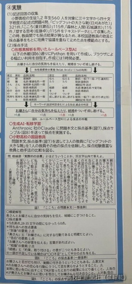 まずは生徒560人に、解答字数が30~40字程度の問題4問に答えてもらった。採点のポイントをAIに覚えさせて判断する「ルールベース型AI」と、すでに学んだ知識を応用して採点する「転移学習を用いた生成AI」の2種類を用意し、国語の先生の採点と比べた。